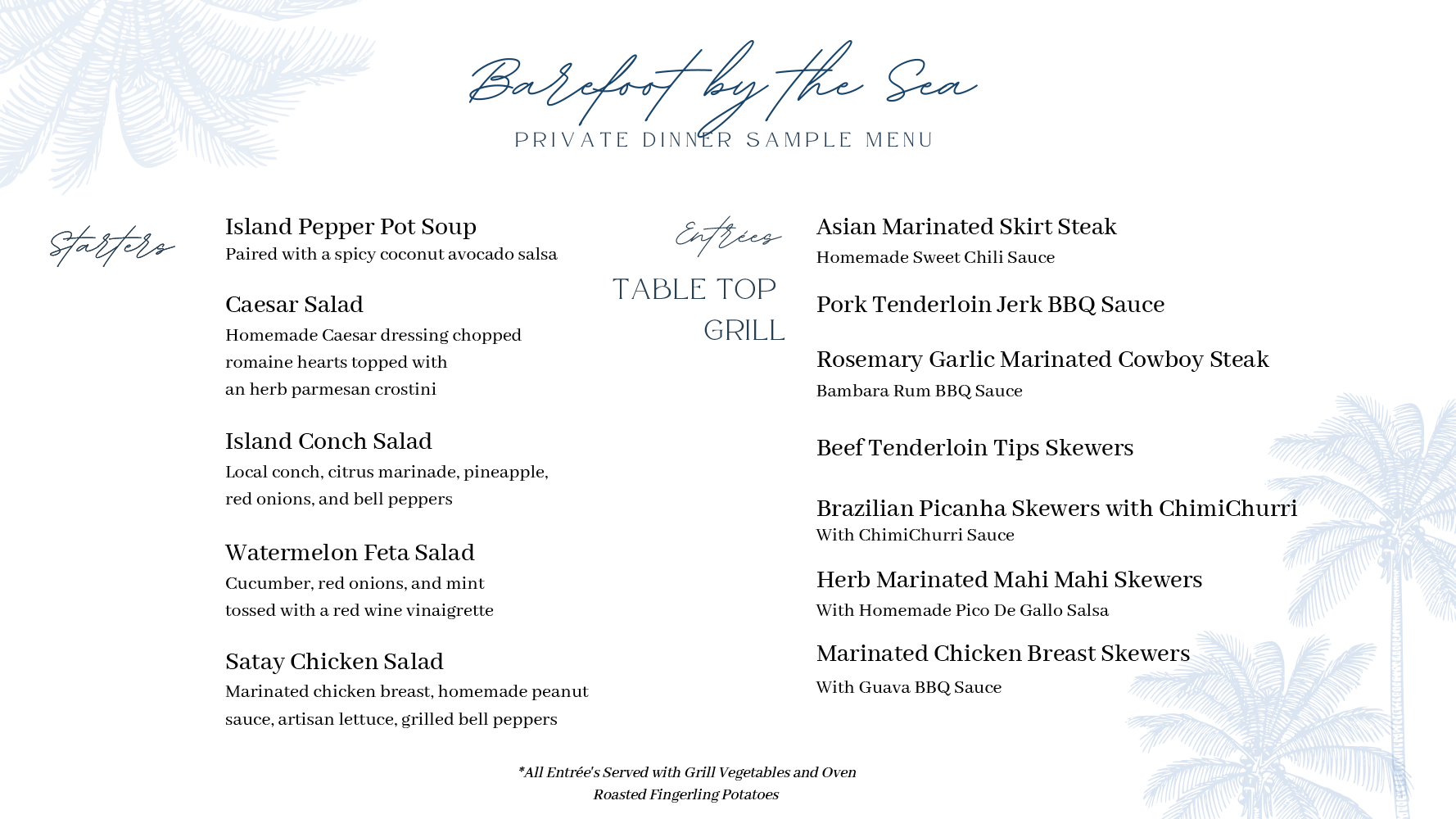 For an added fee, elevate your dining experience with a just-for-you menu, exclusive to our private dinner setting. It’s the perfect way to celebrate a romantic anniversary, honeymoon, birthday, or other special occasion. With specialties like Brazilian Picanha Skewers with ChimiChurri, Island Conch Salad, and Island Pepper Pot Soup, indulge in a memorable culinary adventure under the stars by the sea.
